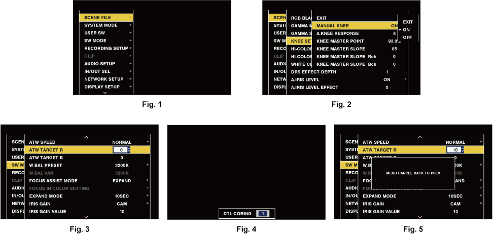 In some menus, a screen for setting value is displayed on the menu screen (Fig. 3) or at the bottom of the screen (Fig. 4).