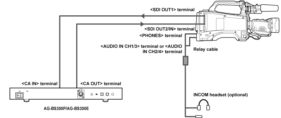 Connect the <SDI OUT1> terminal of the camera with the <CA IN> terminal of AG-BS300P/AG-BS300E, and the <SDI OUT2/IN> terminal of the camera to <CA OUT> terminal of AG-BS300P/AG-BS300E with the BNC cables.