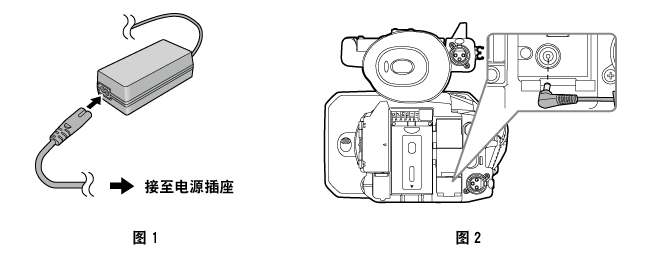 安装AC适配器 使用随附的AC适配器。请勿使用其它设备的AC适配器。随附的交流电缆为本摄像机专用。请勿用于任何其它设备。此外,请勿将其他设备的交流电缆用于本摄像机。 接至电源插座 图1 图2 将交流电缆连接到AC适配器。(图1) 插入交流电缆到底。 将电源插头连接到电源插座。(图1) 将AC适配器连接到〈DC IN 12V〉端子。(图2) 拆除AC适配器时,务必将电源开关设为〈 〉(待机),拆除前检查LCD液晶屏是否已关闭。