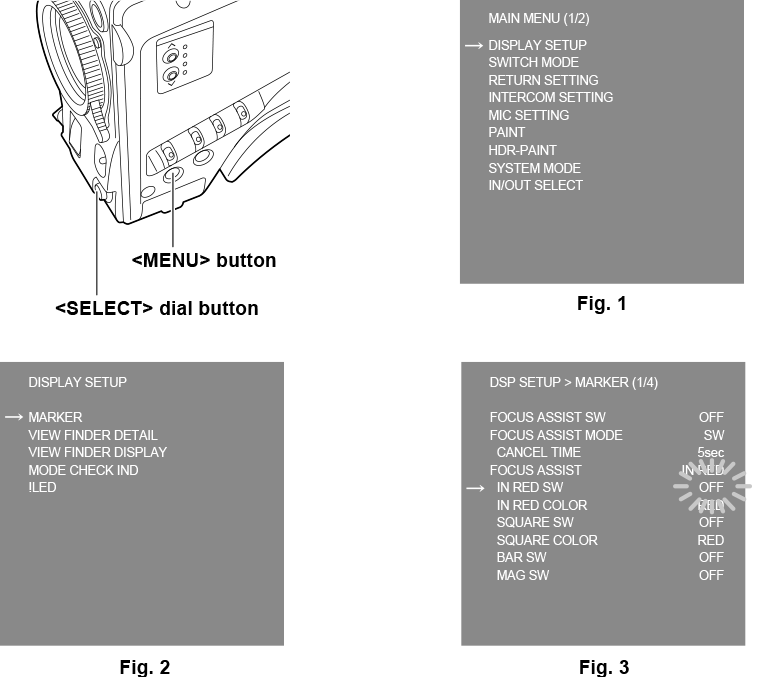 The [MAIN MENU] screen of the camera is displayed on the viewfinder or monitor. (Fig. 1)