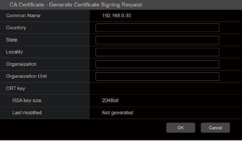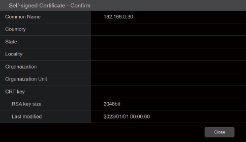 - When the [Confirm] button is clicked, the content of the installed server certificate (security certificate) is displayed in the [CA Certificate - Confirm] dialog. (An asterisk is displayed in the [Organizational Unit] field only.)