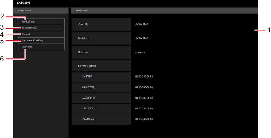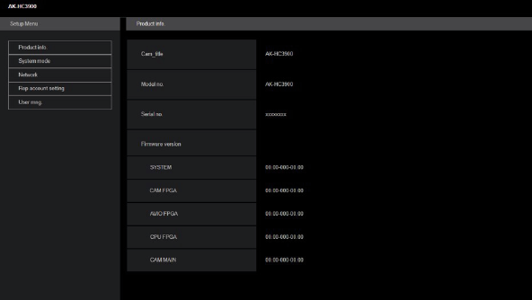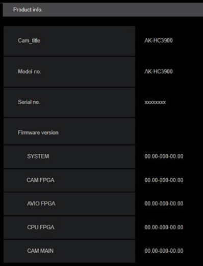 The [Model no.], [Serial no.], [Firmware version] and other information about the unit is displayed.