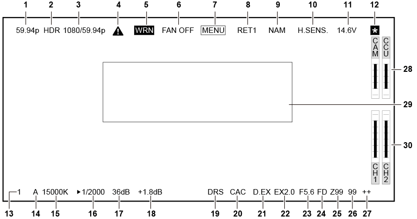 寻像器画面上会显示广播级4K演播室便携式摄像机设置和指示操作状态的消息。