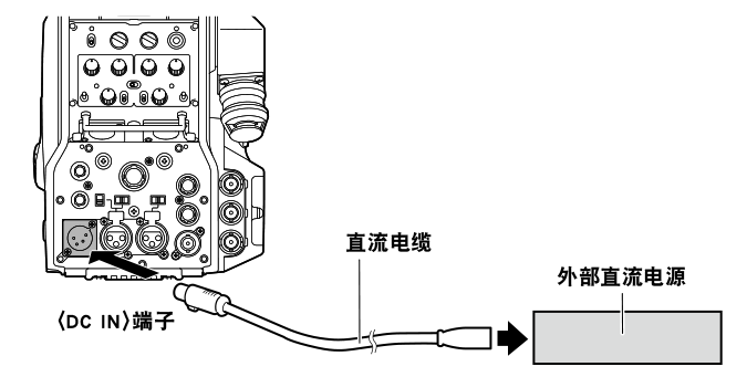 - 将外部直流电源连接到摄像机的〈DC IN〉端子。
